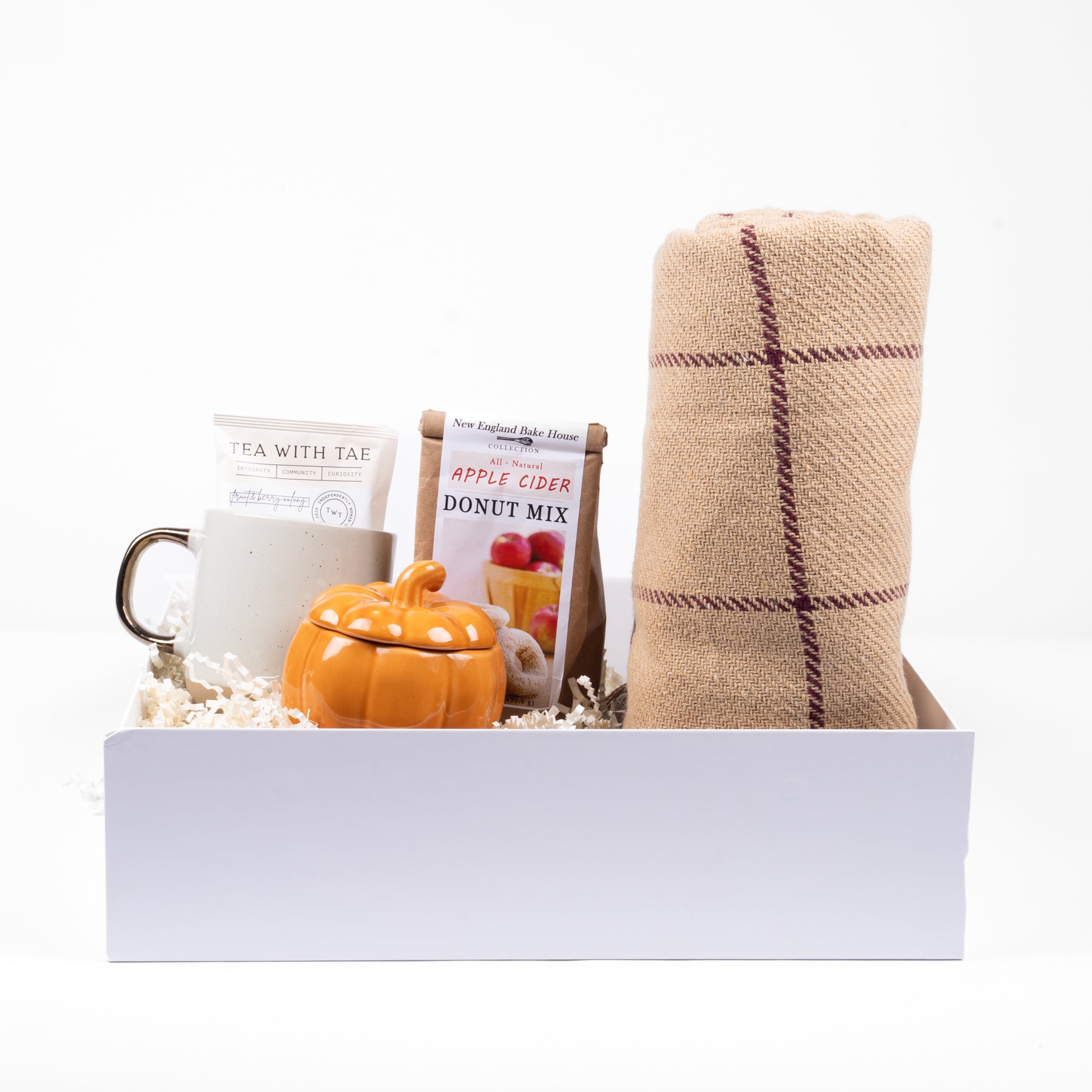 Celebrate cozy fall vibes with the Hey Pumpkin box! Whip up warm, delicious treats with the included donut mix, then curl up in a soft blanket. Sip your favorite brew from a stylish two-tone mug while savoring a comforting cup of tea. Finish it all off with the sweet glow of a pumpkin candle—everything you need for a perfectly pumpkin-packed day!
